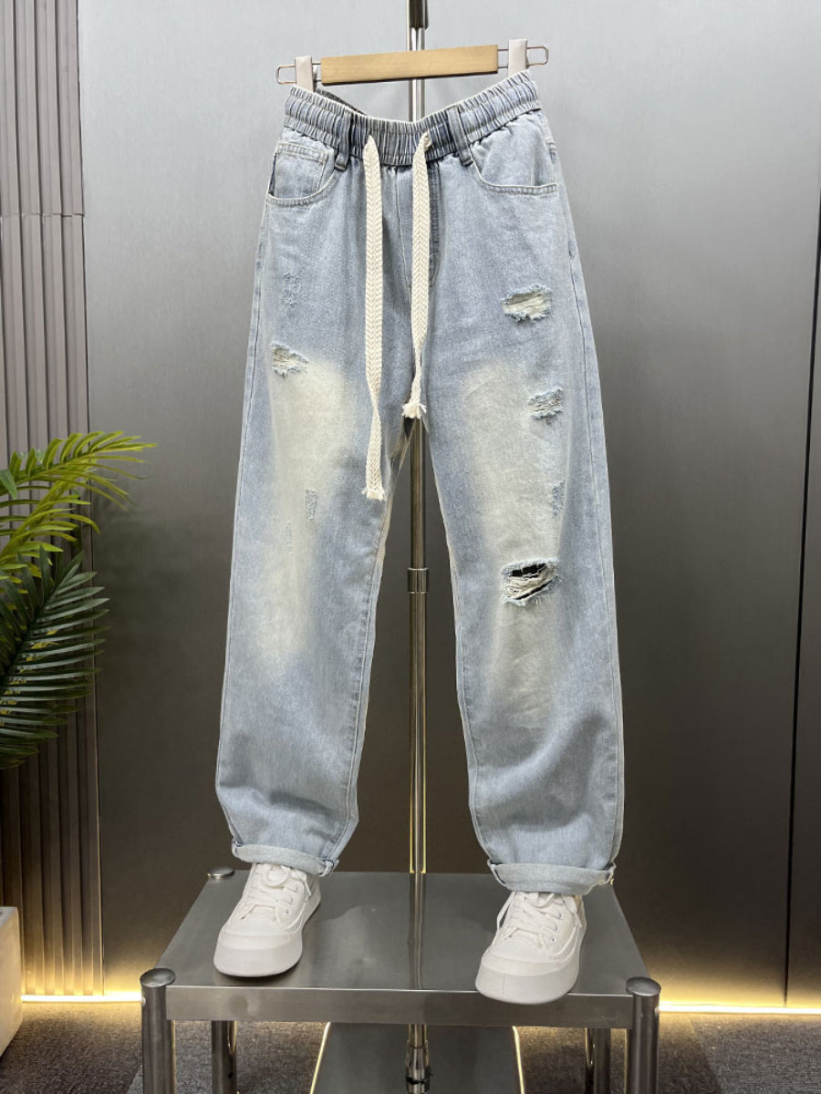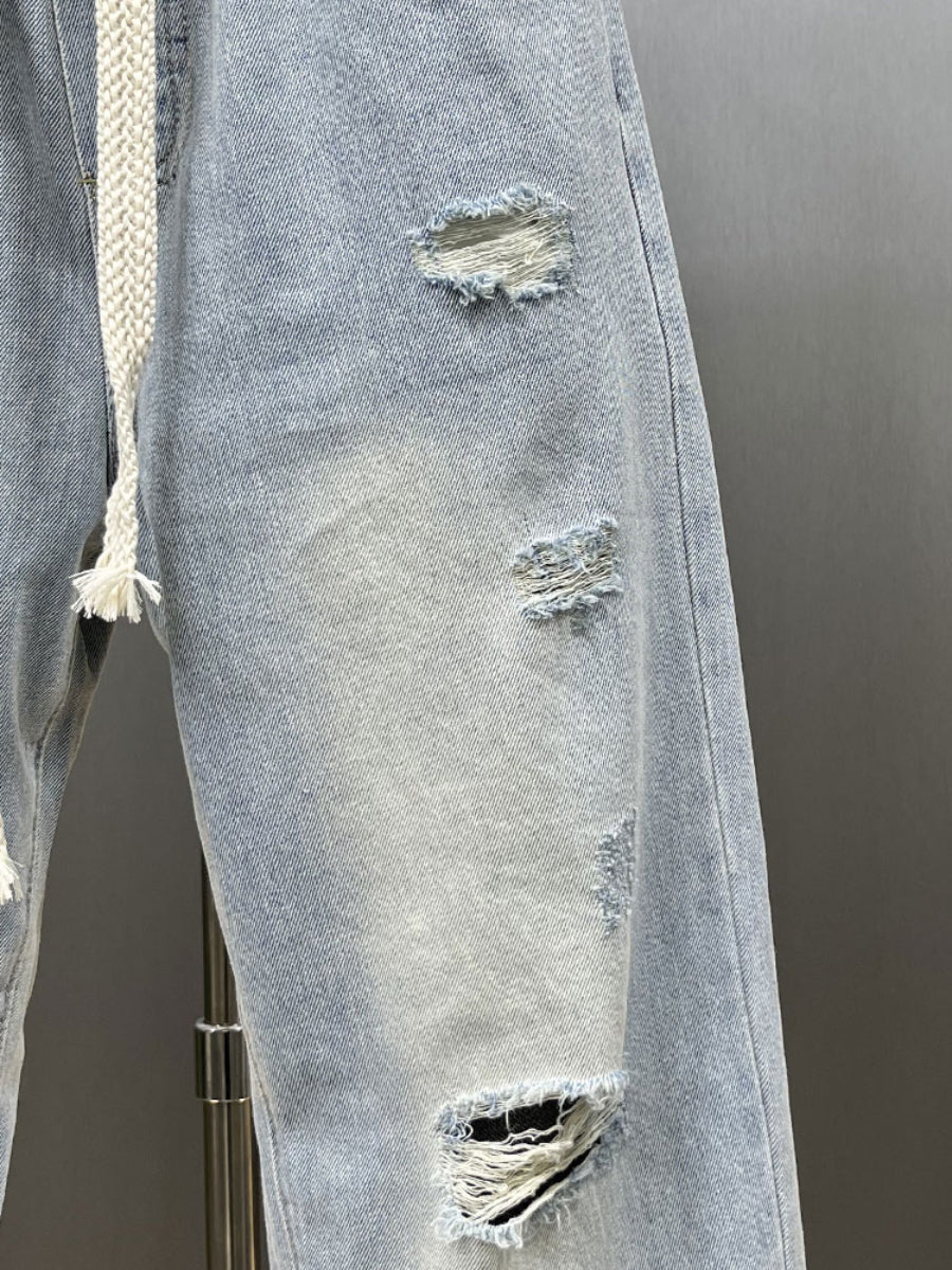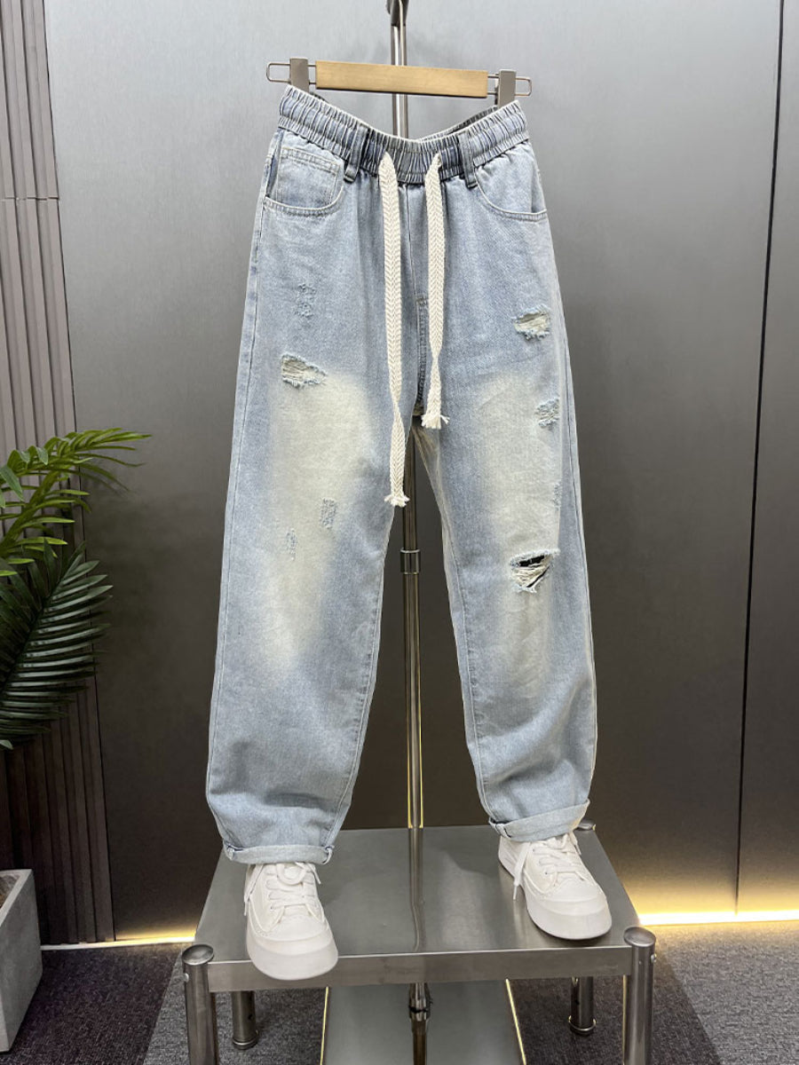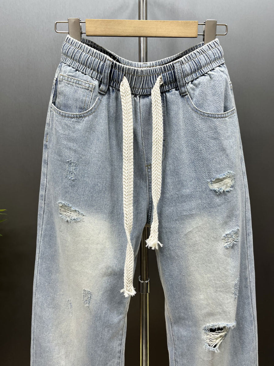 American Drawstring Ripped Denim Harem Wide-leg Pants