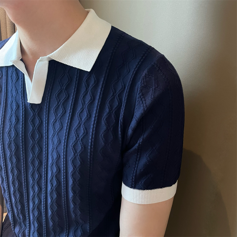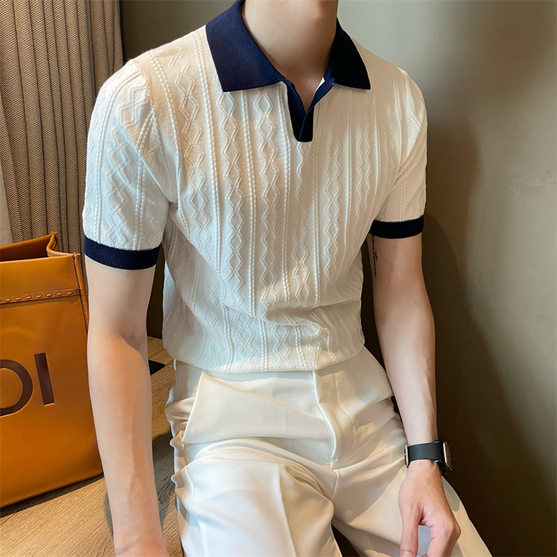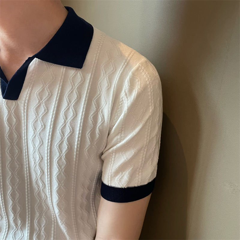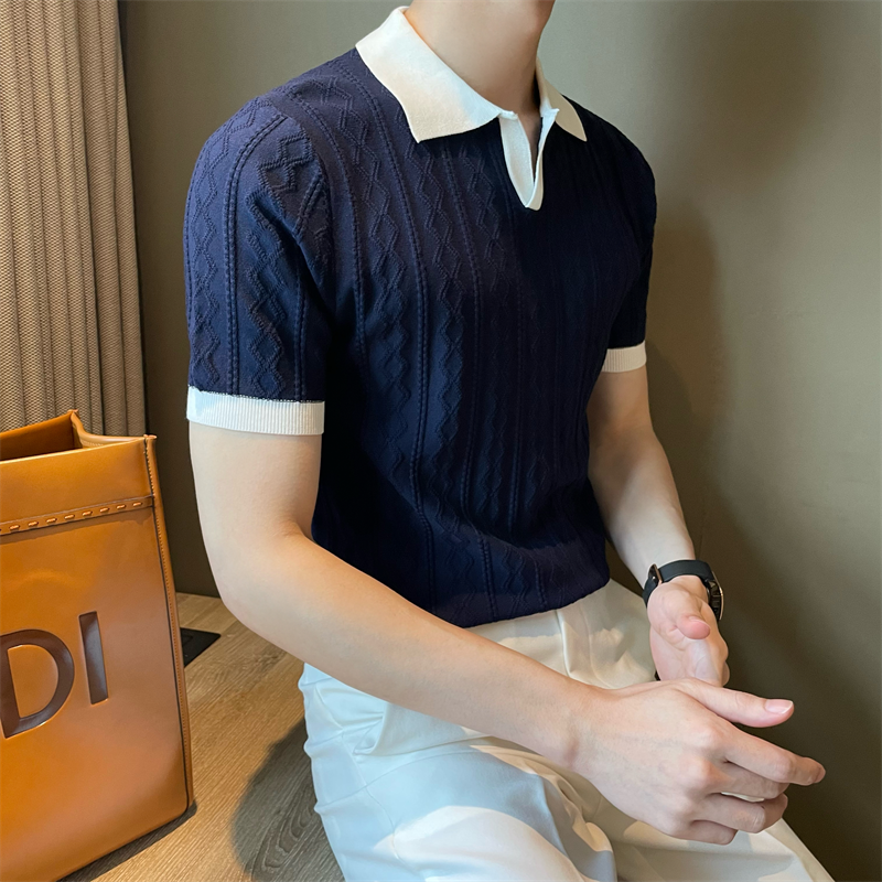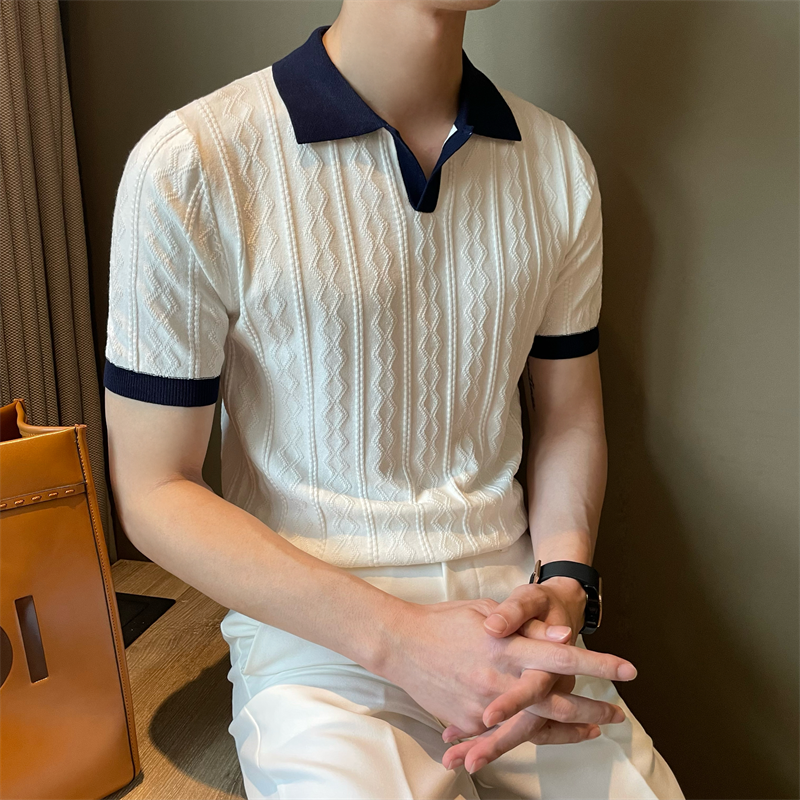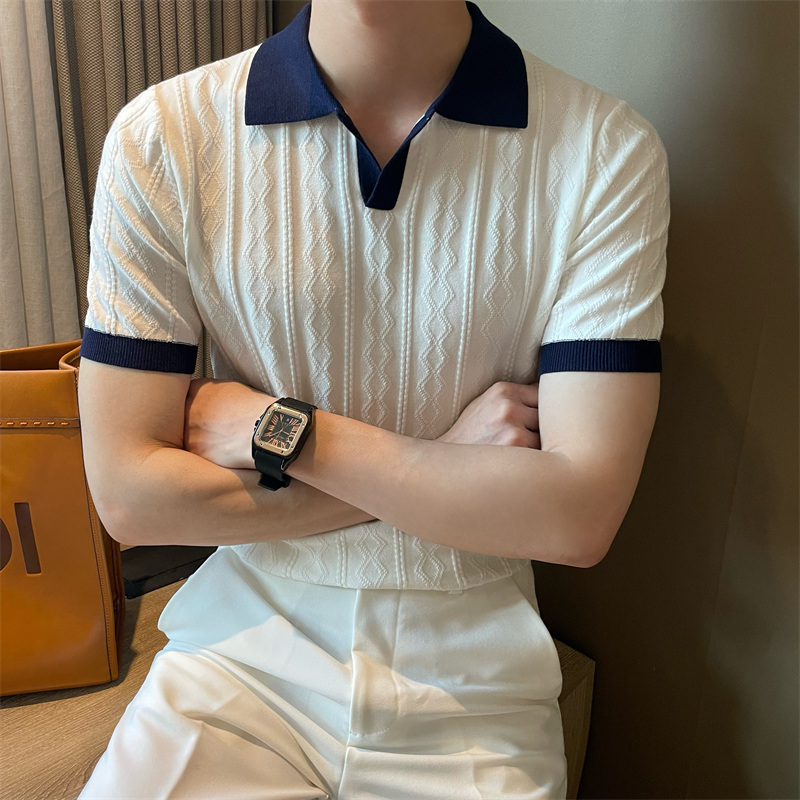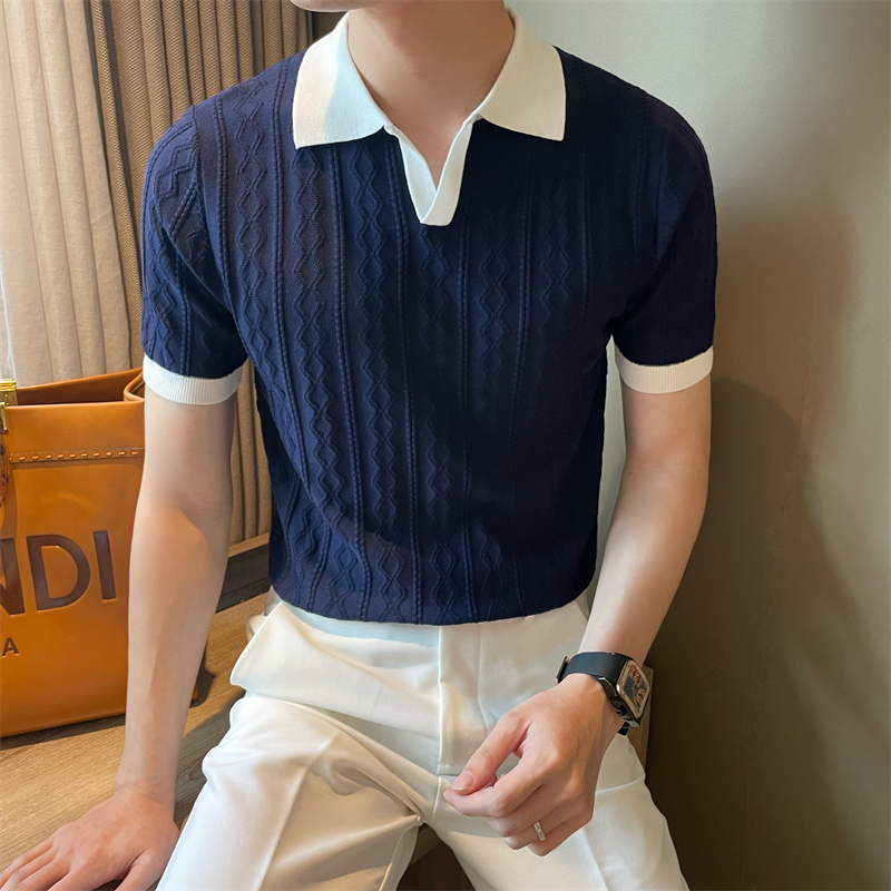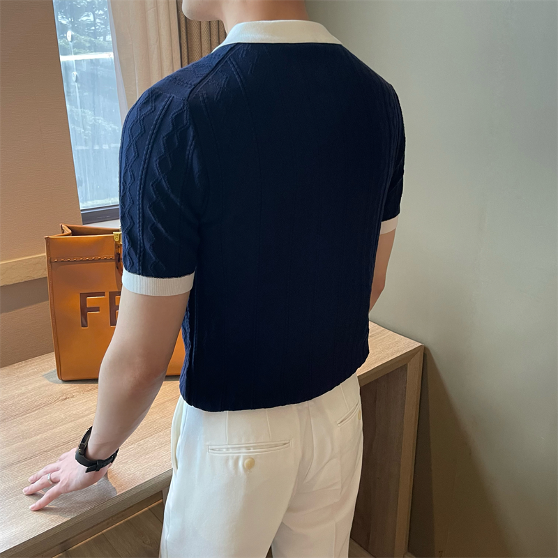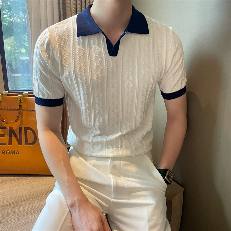 Colorblock V-neck Patterned Knitted Short-sleeved Shirt