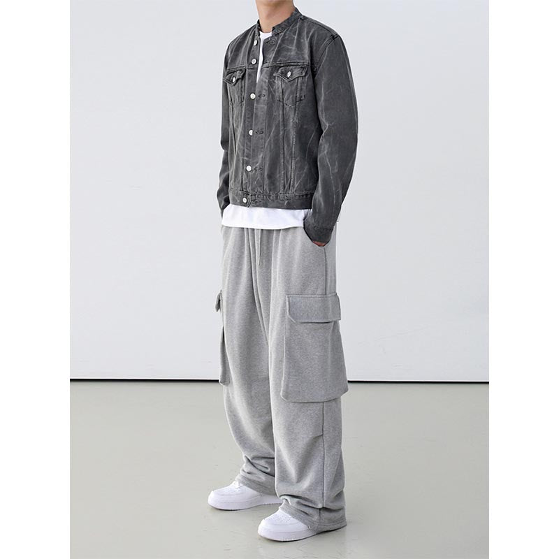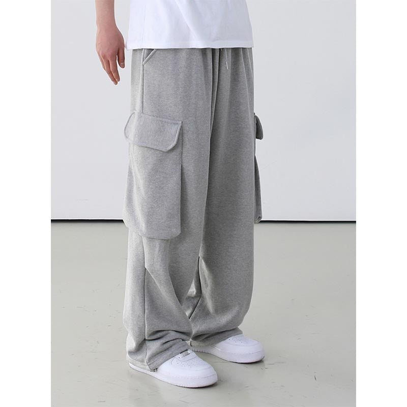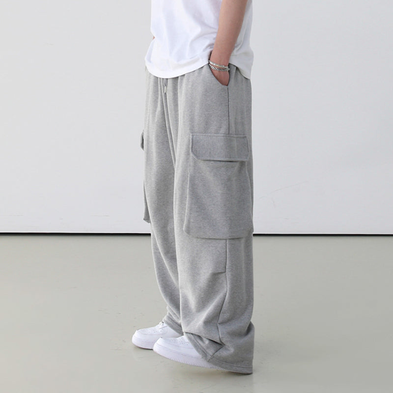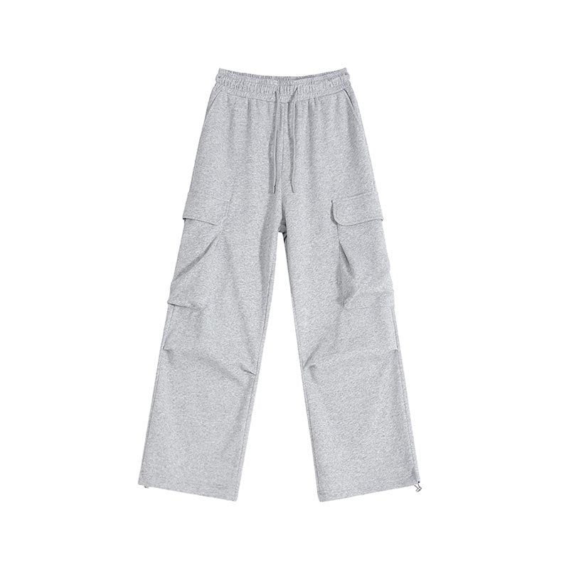 Drapey Gray Cargo Pants, Loose Wide-Leg Long Pants