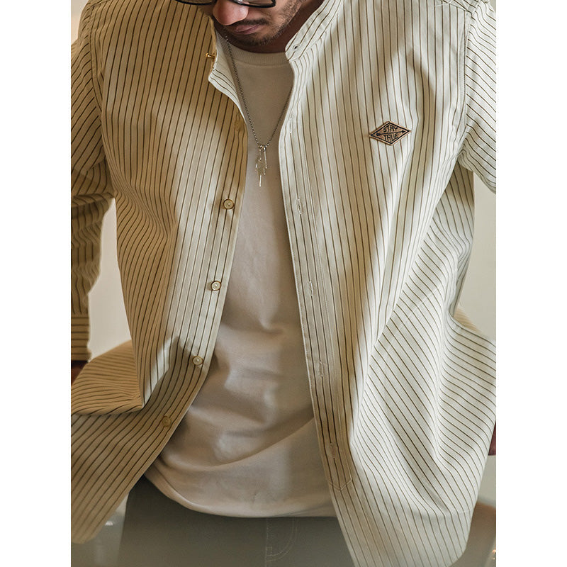 Mens Retro Stand Collar Vertical Pinstripe Long Sleeve Shirt