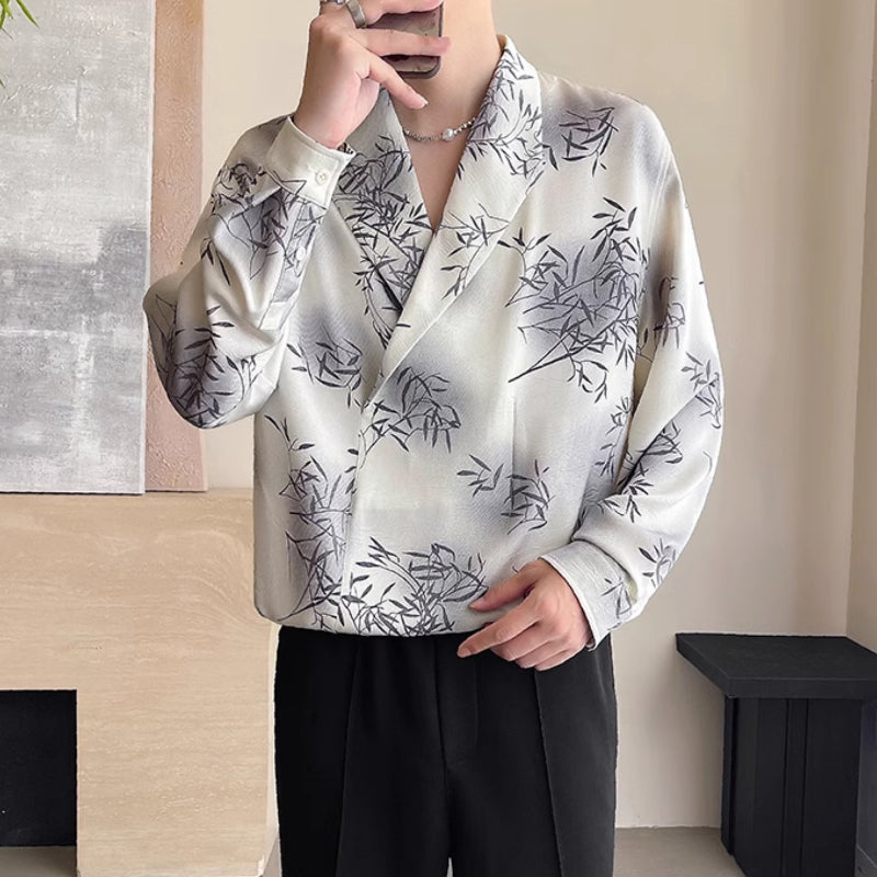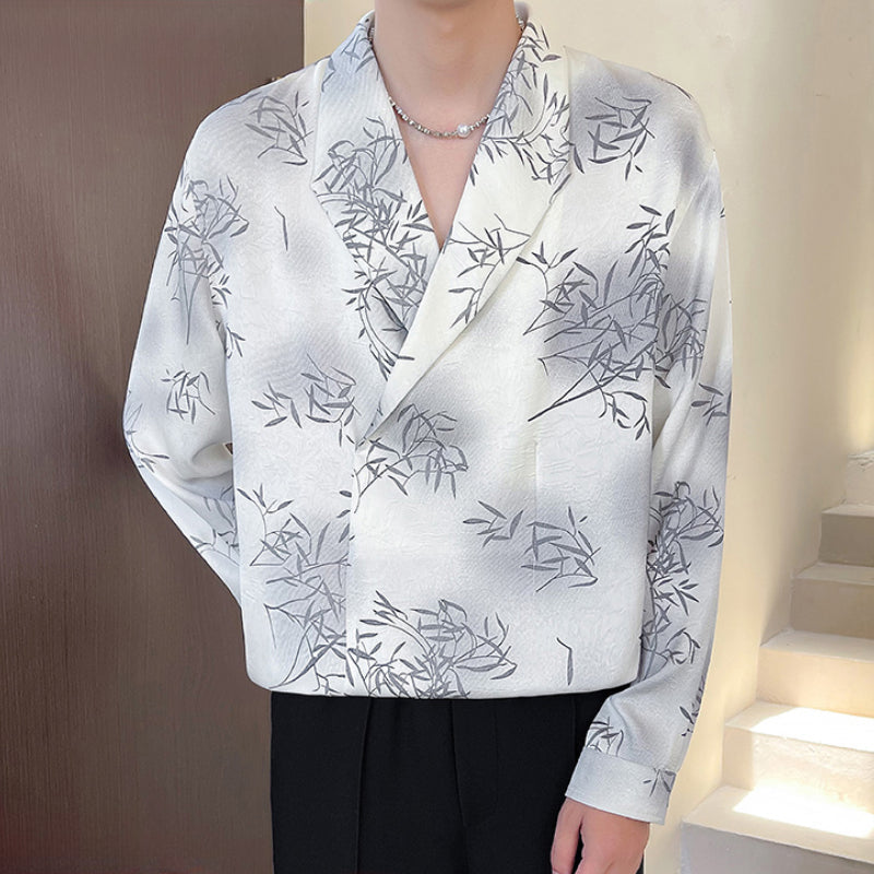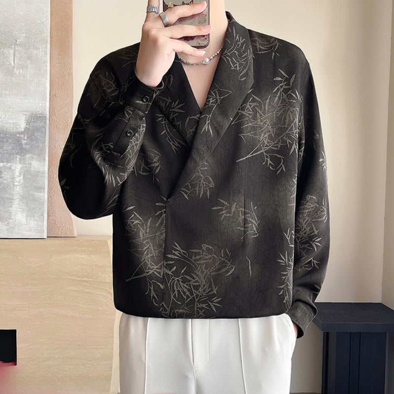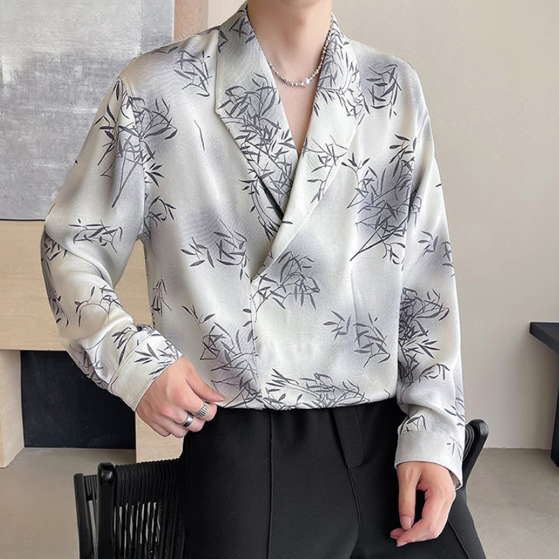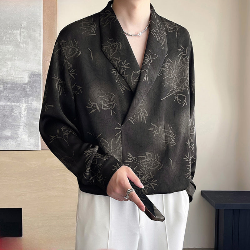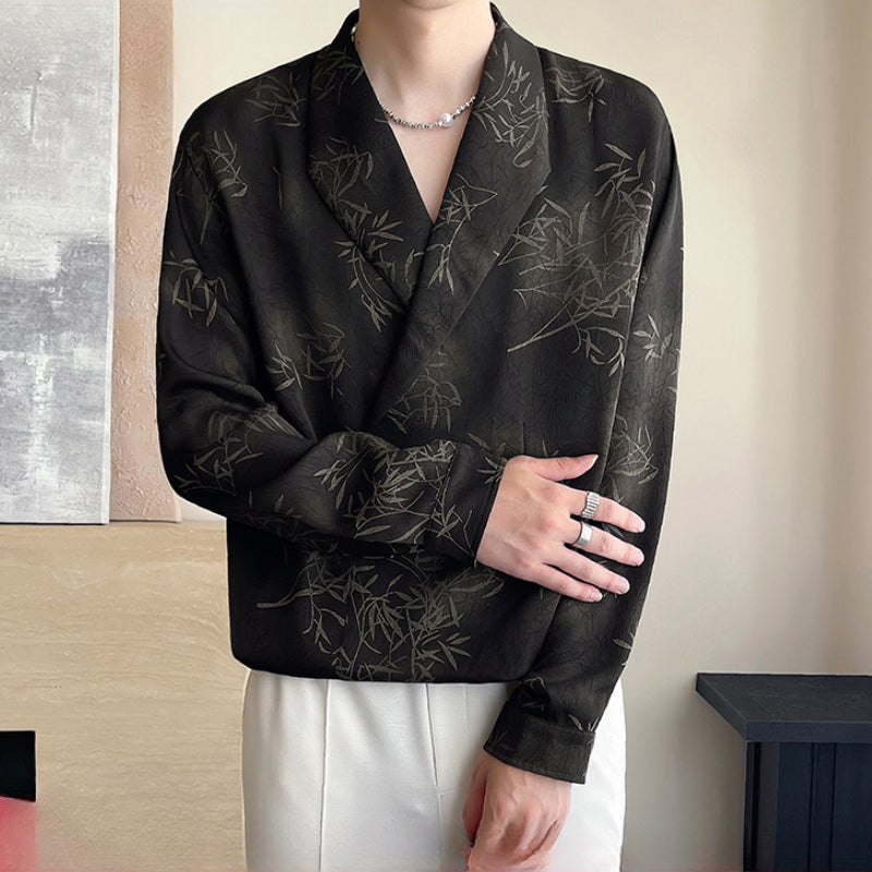 Shawl Collar Satin V-neck Long Sleeve Shirt